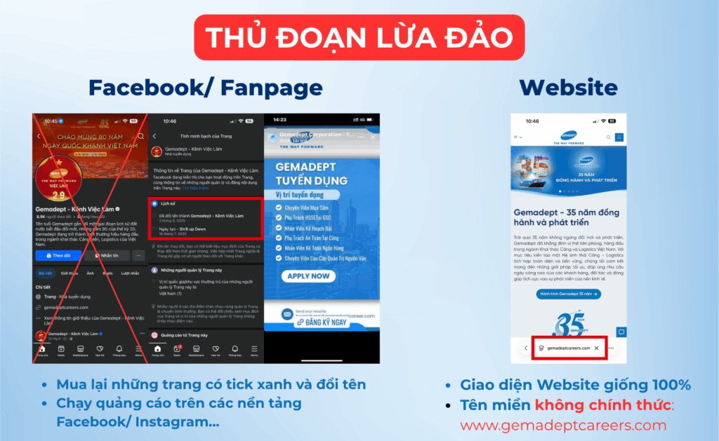 - Tạo Fanpage giả mạo (ví dụ: “Gemadept Tuyển Dụng”) yêu cầu chuyển tiền hoặc tải ứng dụng lừa đảo.