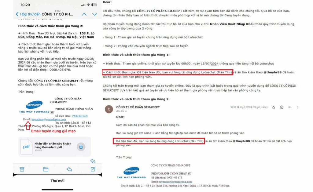 Riêng trong hoạt động tuyển dụng, các đối tượng xấu đã mạo danh Gemadept lập các fanpage đăng tuyển việc làm, yêu cầu ứng viên tham gia vào nhiều hội nhóm trên nền tảng như Lotuschat/Telegram/ Zalo/ Viber… Sau đó, yêu cầu ứng viên tải thêm nhiều ứng dụng khác, tạo tài khoản trên các trang web xổ số, các trang thương mại điện tử… để thực hiện chuyển tiền trực tuyến vào tài khoản của các tổ chức, cá nhân mạo danh hoặc yêu cầu ứng viên chuyển tiền để có thể tham gia phỏng vấn.